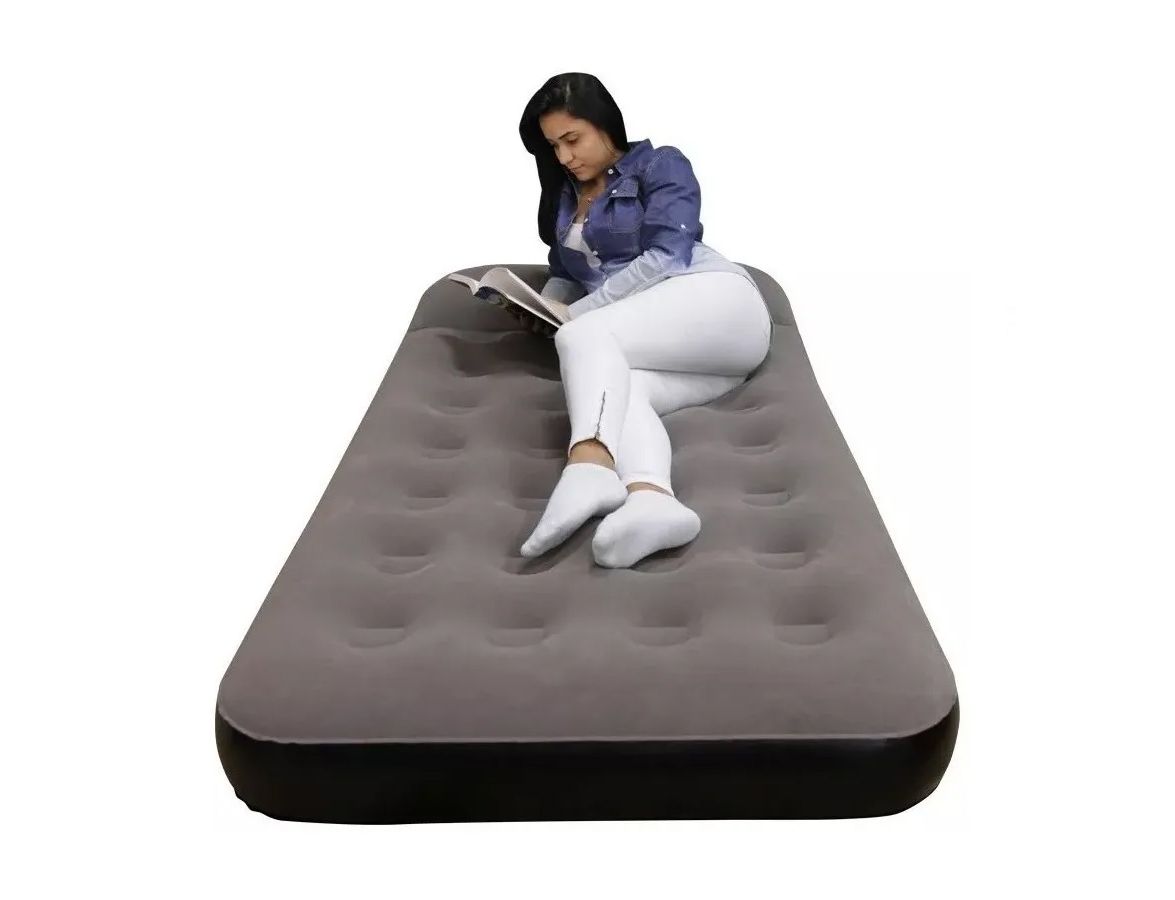 É um colchão inflável confortável e ainda tem travesseiro incorporado. Desenvolvido com a mais alta tecnologia é resistente, toque aveludado e utiliza em sua composição 70% de material reciclado com base em PVC.